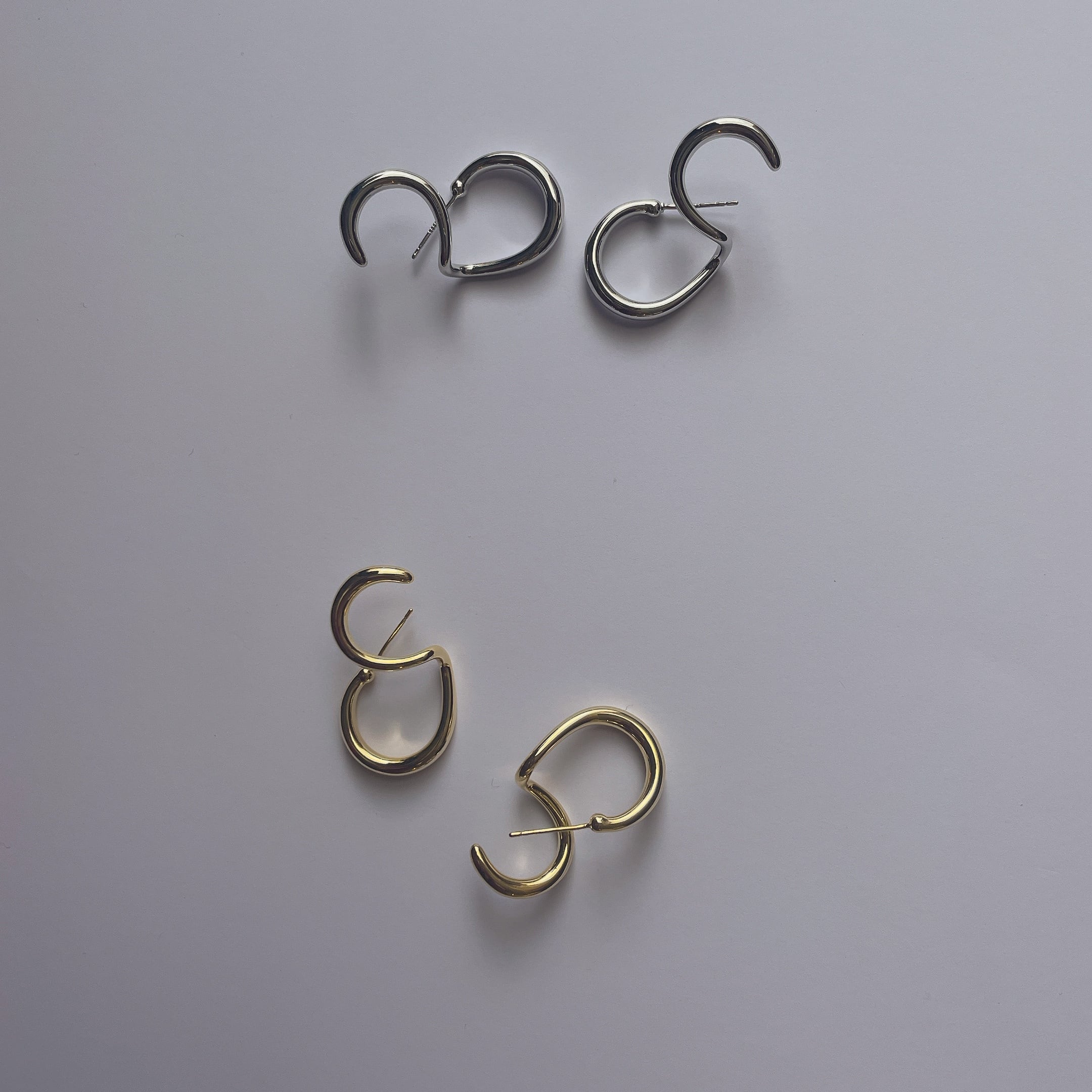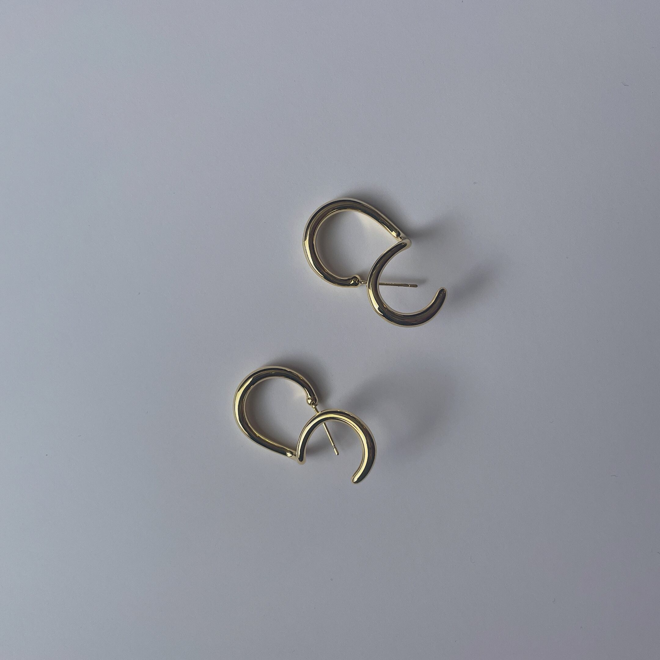 ピアスを耳に通し、くるっと回転させるとイヤーカフの様に耳にフィットするデザインのピアスです。